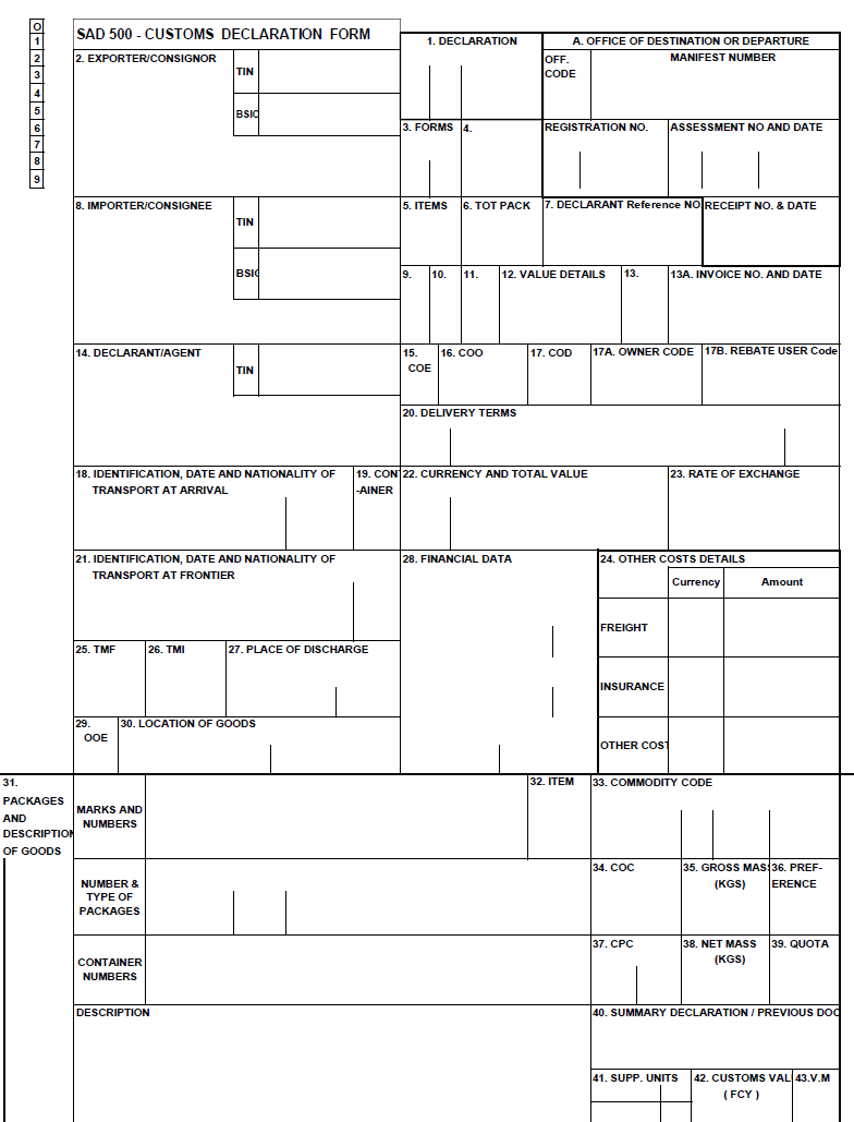 南非稱之為“Bill of Entry – SAD500”,英國稱之為“Export Declaration (using the NES)”,日本稱之為“Customs form C-5010”,加拿大稱之為“B13A – Export Declaration”,等等和 等等,可能看起來像下面..